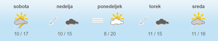 Jutri bo večinoma oblačno in deževno. Ponekod bo pihal severovzhodni veter, na Primorskem dopoldne šibka do zmerna burja. Jutranje temperature bodo od 6 do 12, najvišje dnevne od 12 do 16, na Primorskem do 19 stopinj Celzija.