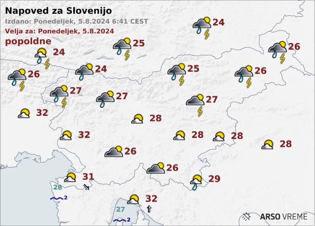 Ponoči se bo v vzhodni in osrednji Sloveniji pooblačilo, zaradi česar lahko pade kakšna kaplja dežja. Najnižje jutranje temperature bodo od 14 do 18, na Primorskem okoli 20 stopinj Celzija.