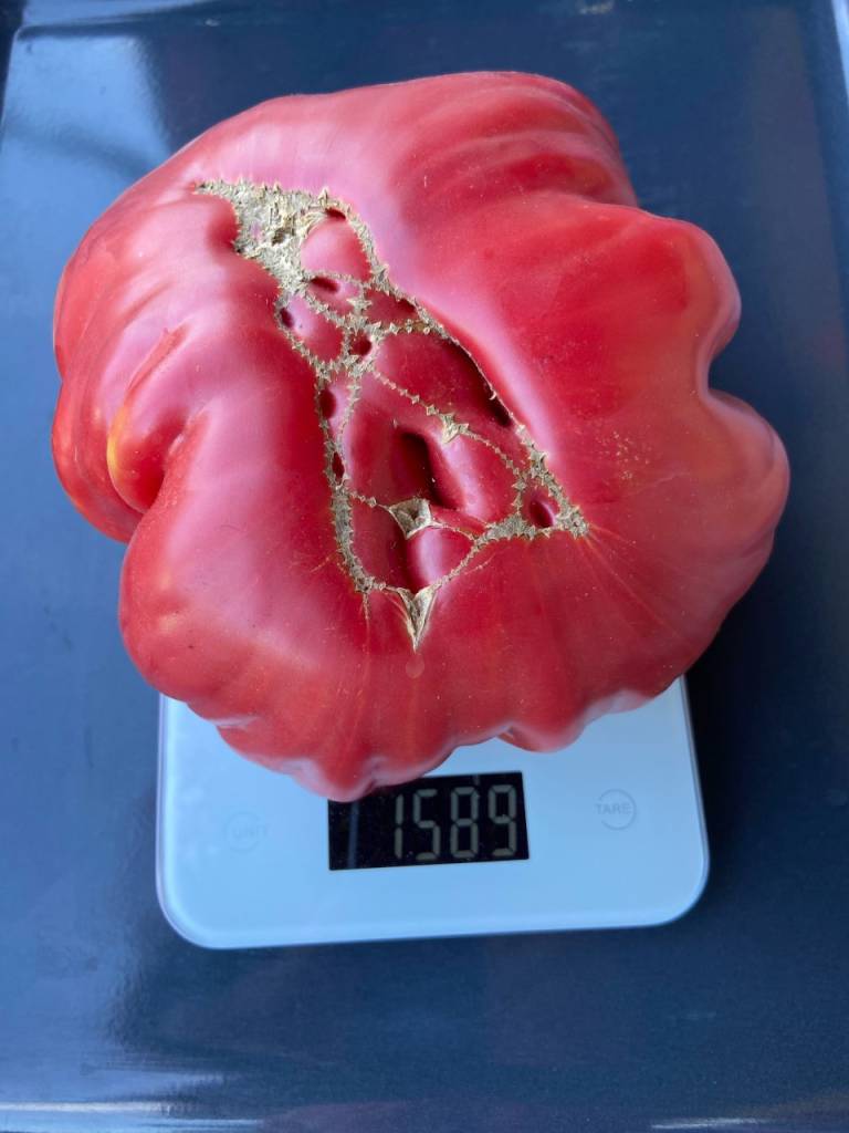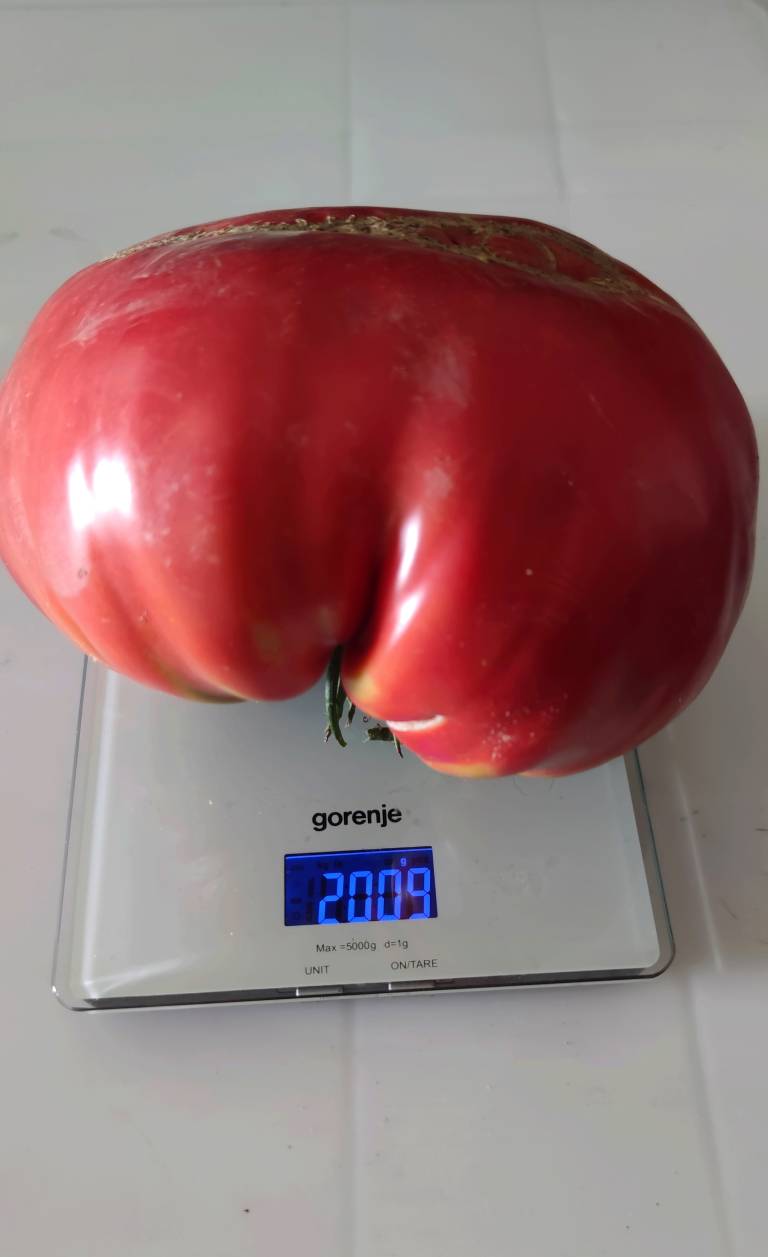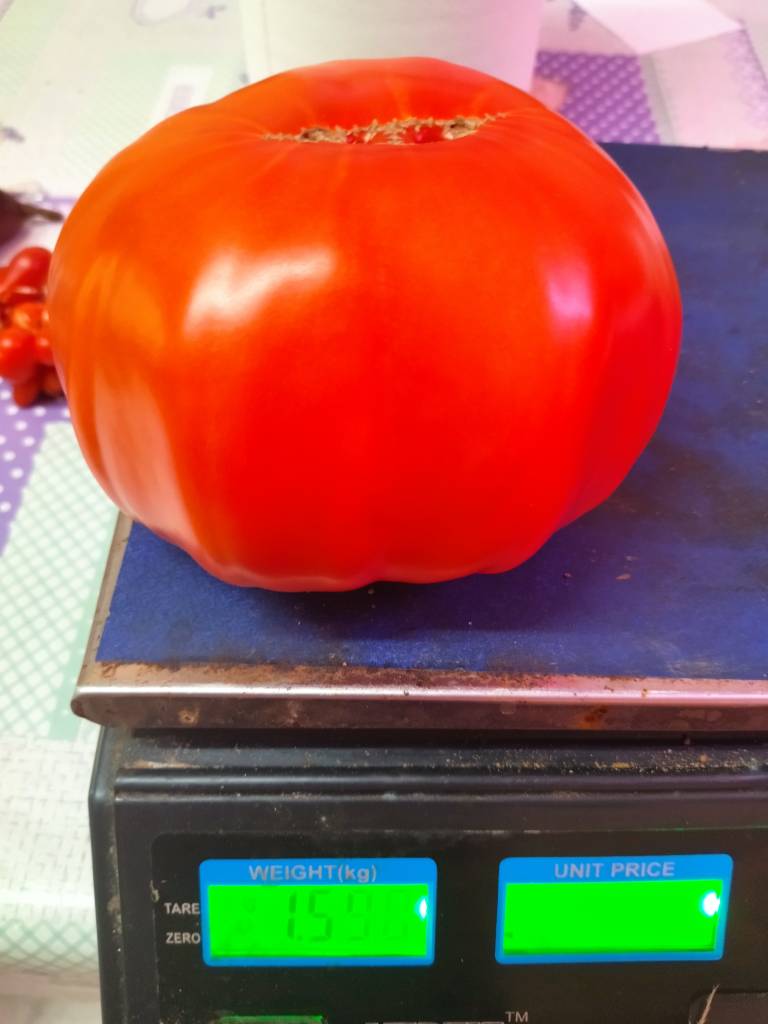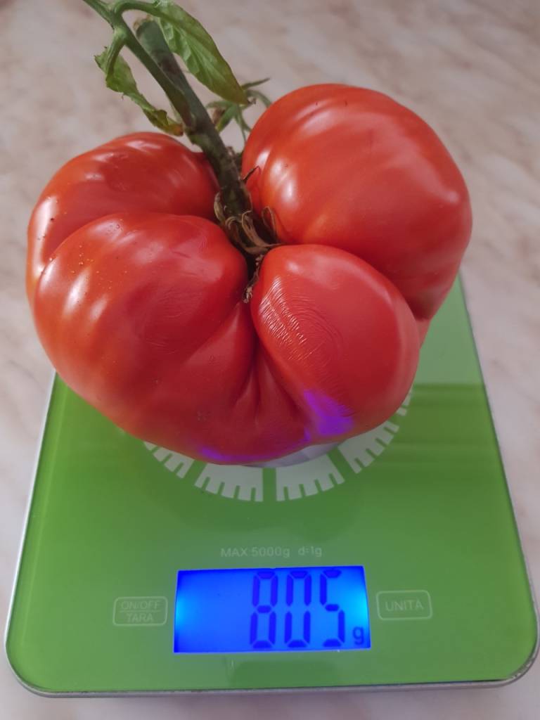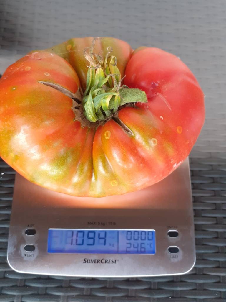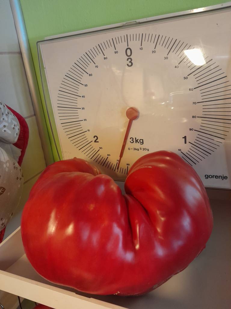 Paradižnik, ki ga lahko vidite na fotografiji, pa tehta 1100 gramov, kot vidite na razvidno na tehtnici.