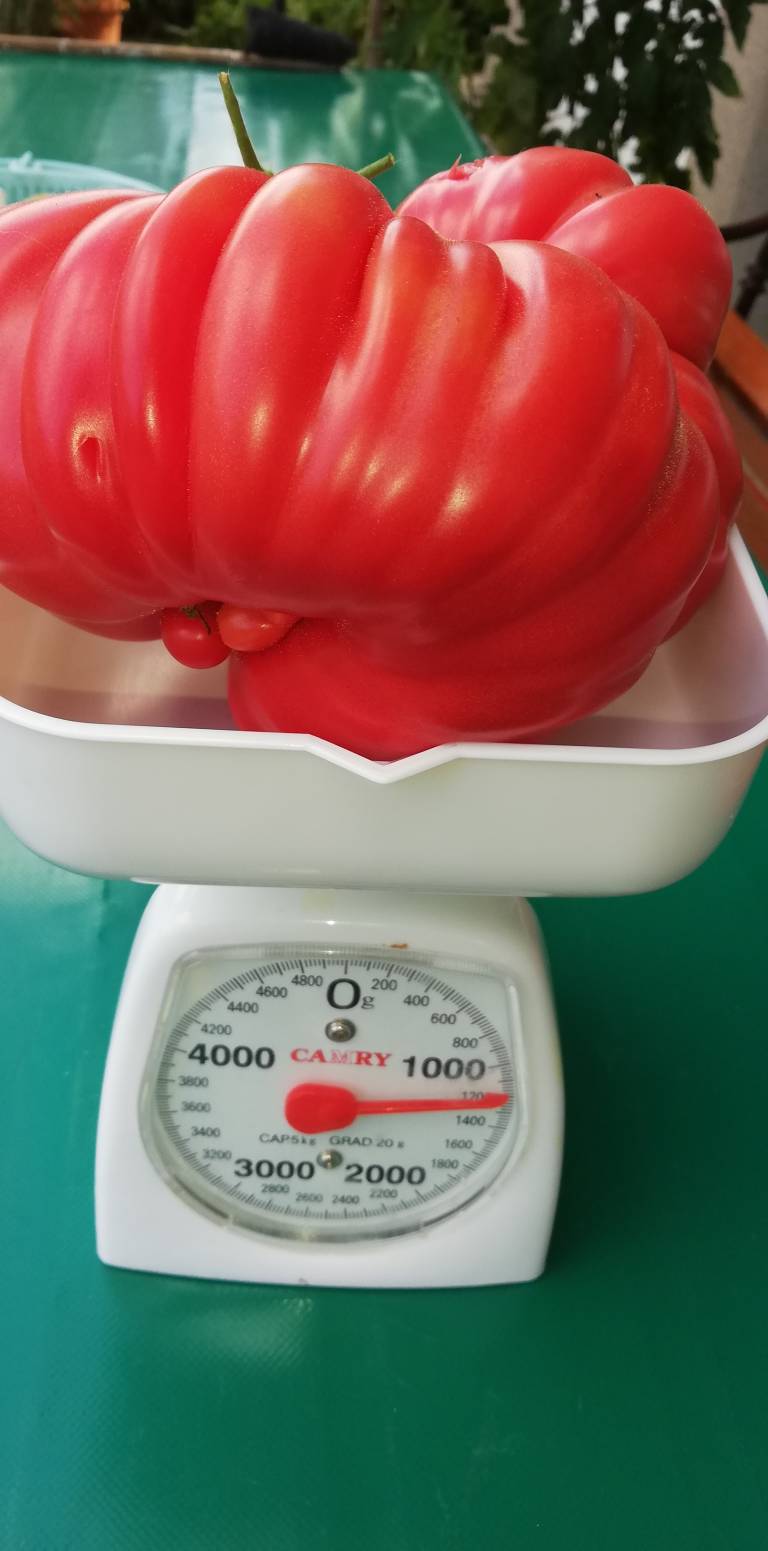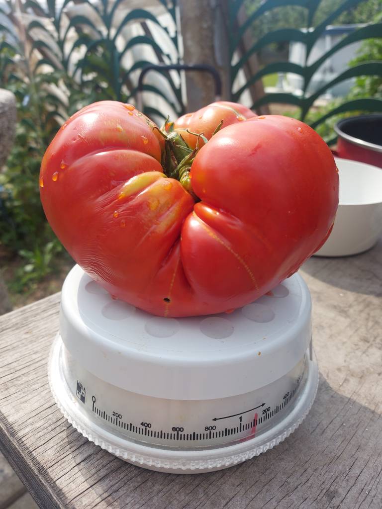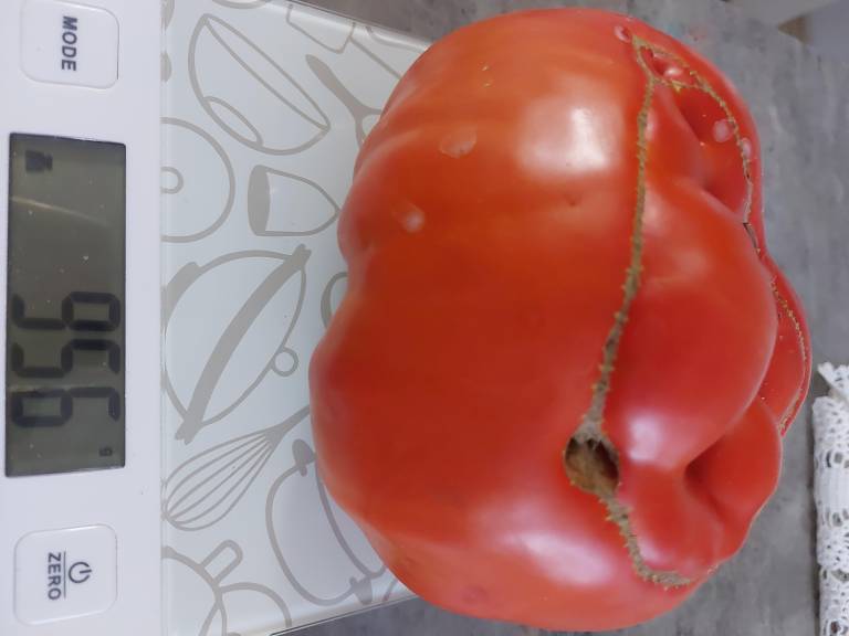 Irena Namestnik iz Laškega, je letos pridelala zelo velik paradižnik, ob fotografiji pa pripisala: »Na rastlini so rastli samo trije plodovi in samo eden je bil tako velik. Zalivamo iz vodnjaka pod vrtom, z dodatkom gnojila za paradižnik Plantela.«