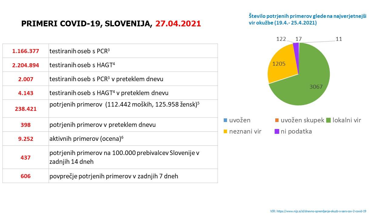 V Sloveniji smo sicer s PCR-testi testirali že več kot milijon oseb, s HAGT-testi pa že preko dva milijona. Število potrjenih primerov na 100.000 prebivalcev Slovenije v zadnjih 14 dneh znaša 437.