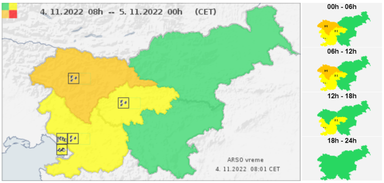 Za severozahod države so izdali oranžno opozorilo. Za osrednjo in jugozahodno Slovenijo velja rumeno opozorilo.