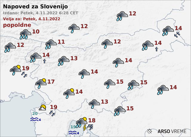 Popoldne bodo padavine od zahoda postopno slabele in do večera večinoma ponehale. Ob morju bo dopoldne pihal okrepljen jugo. Najvišje dnevne temperature bodo od 10 do 15, ob morju do 18 stopinj Celzija.
