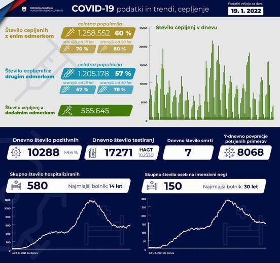 V Sloveniji so včeraj, 19. januarja, opravili 17.271 PCR testiranj na koronavirus in potrdili 10.288 novih okužb, gre za 59,6-odstotni delež okužb.
