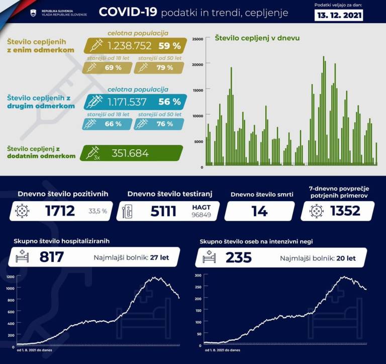 V Sloveniji so včeraj, 13. decembra, opravili 5111 PCR testiranj na koronavirus in potrdili 1712 novih okužb, gre za 33,5-odstotni delež okužb.