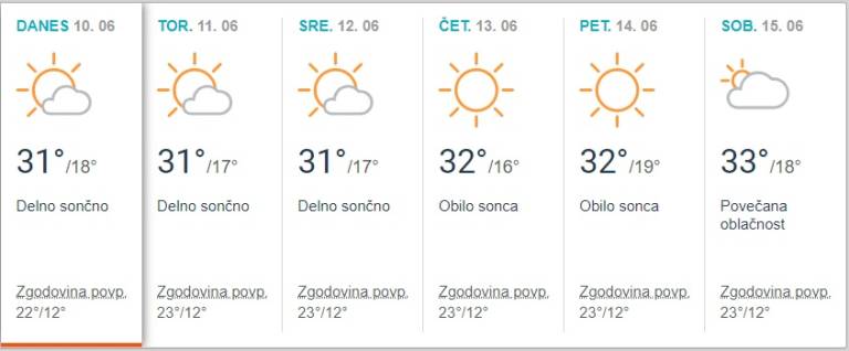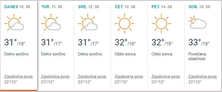 Popoldne bo povečini sončno, na zahodu občasno zmerno oblačno, predvsem v gorskem svetu nastane kakšna vročinska nevihta. Pihal bo šibak veter vzhodne do južne smeri. Najvišje dnevne temperature bodo od 29 do 33 stopinj Celzija.