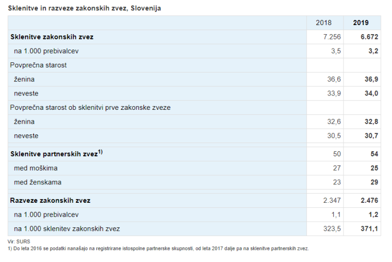 Razvezanih zakonskih zvez pa je bilo lani za 5,5 odstotka več kot leto prej. Njihove zakonske zveze so trajale povprečno 14,3 leta. 40 zakonskih zvez je bilo razvezanih že v prvem letu zakona, 17 parov pa se je razvezalo po 50 ali več letih zakona. Povprečna starost razvezanih mož je bila 46,8 leta, povprečna starost razvezanih žena pa 43,9 leta.