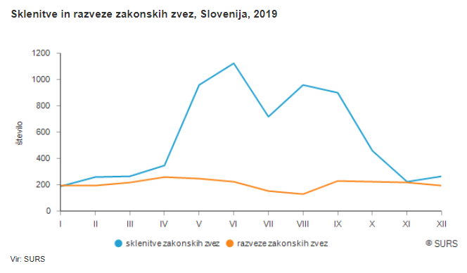 Število sklenitev zakonskih zvez je bilo lani za osem odstotkov nižje kot leto prej. Največ parov, in sicer več kot 1100, se je poročilo junija. Najmanj zakonskih zvez, in sicer 186, pa je bilo sklenjenih januarja, kažejo podatki Statističnega urada Republike Slovenije.