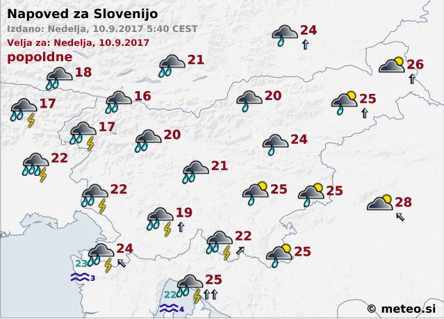 Od danes do torka zjutraj bo po napovedih vremenoslovcev v zahodni polovici Slovenije pogosto deževalo. Krajevno lahko pade od 100 do 200 litrov dežja na kvadratni meter.