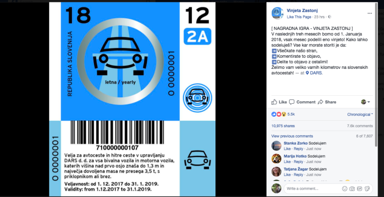 Na družbenem omrežju Facebook se je ponovno pojavila nagradna igra, imenovana »Vinjeta zastonj«, kjer je kot organizator naveden Dars. Toda iz Družbe za avtoceste Republike Slovenije sporočajo, da to ne drži, saj ne organizirajo te nagradne igre.