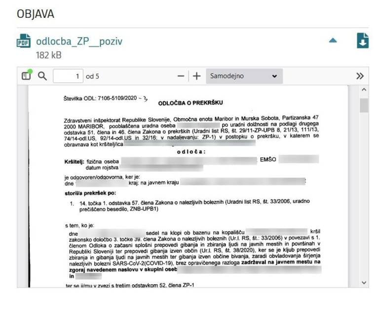 Zdravstveni inšpektorat je minuli teden na oglasni deski eUprave objavil odločbe več deset posameznikov, ki jih ni mogel izročiti kršiteljem protikoronskih ukrepov. Pri tem pa so odločbe objavili z vsemi osebnimi podatki kršiteljev.