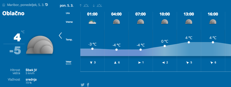Vremenoslovci za danes napovedujejo oblačno vreme. V severni in osrednji Sloveniji bo občasno rahlo snežilo, v južni Sloveniji pa rosilo ali rahlo deževalo, tam bo možnost nastanka poledice in žleda. Najvišje dnevne temperature bodo od -5 do -2 stopinje Celzija.