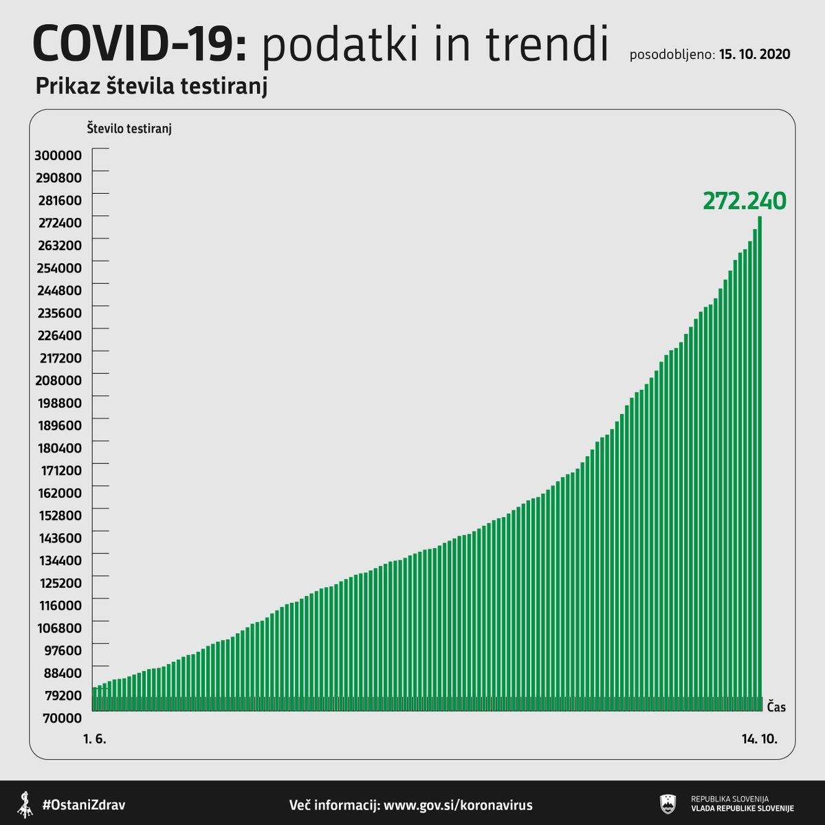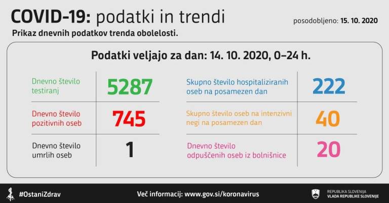 V Sloveniji so v sredo, 14. oktobra, opravili 5287 testiranj na koronavirus. Potrdili so 745 novih okužb. Skupno število vseh doslej potrjenih okužb s koronavirusom v Sloveniji zdaj znaša 10683. Delež pozitivnih testov je tako 14,09-odstoten.