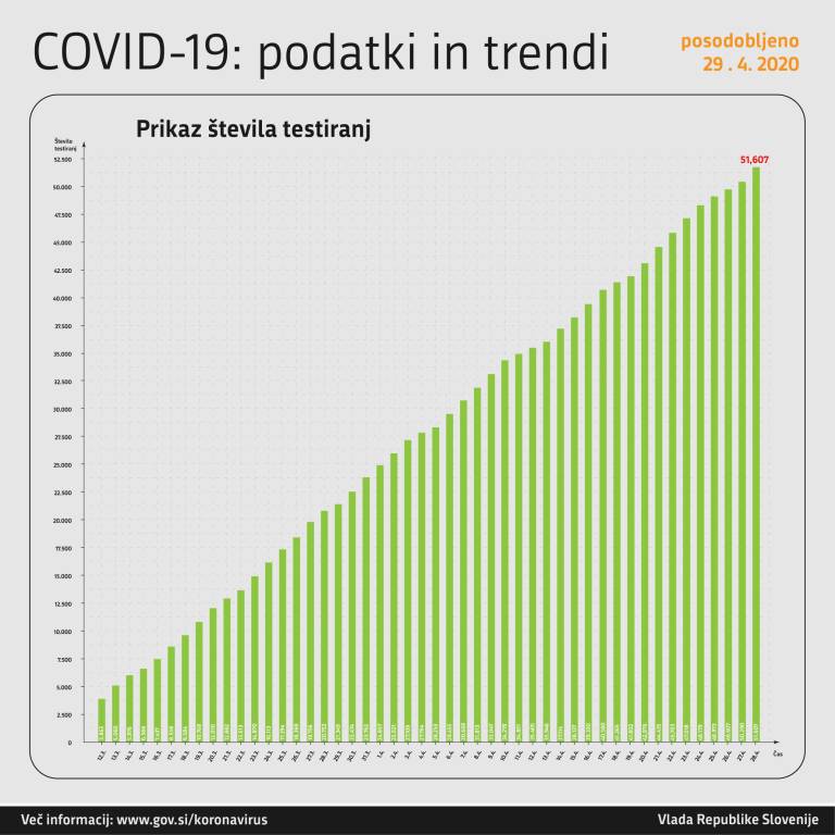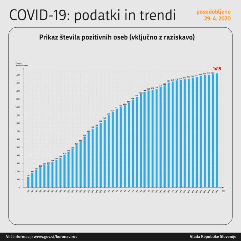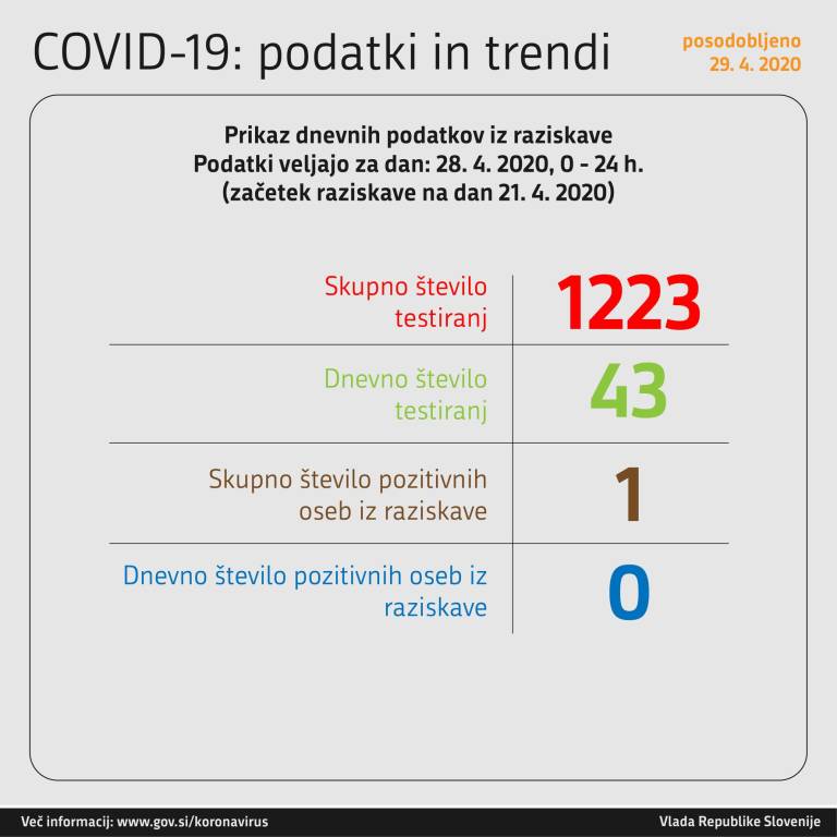 Po zadnjih podatkih, ki jih je sporočil državni vrh, je bilo včeraj v štirindvajsetih urah opravljenih 1317 testiranj, od tega jih je bilo deset pozitivnih na koronavirus. V sklopu raziskave o prekuženosti Slovencev ni bila pozitivna niti ena od včeraj testiranih oseb. Doslej smo v Sloveniji zabeležili 1418 primerov koronavirusa.
