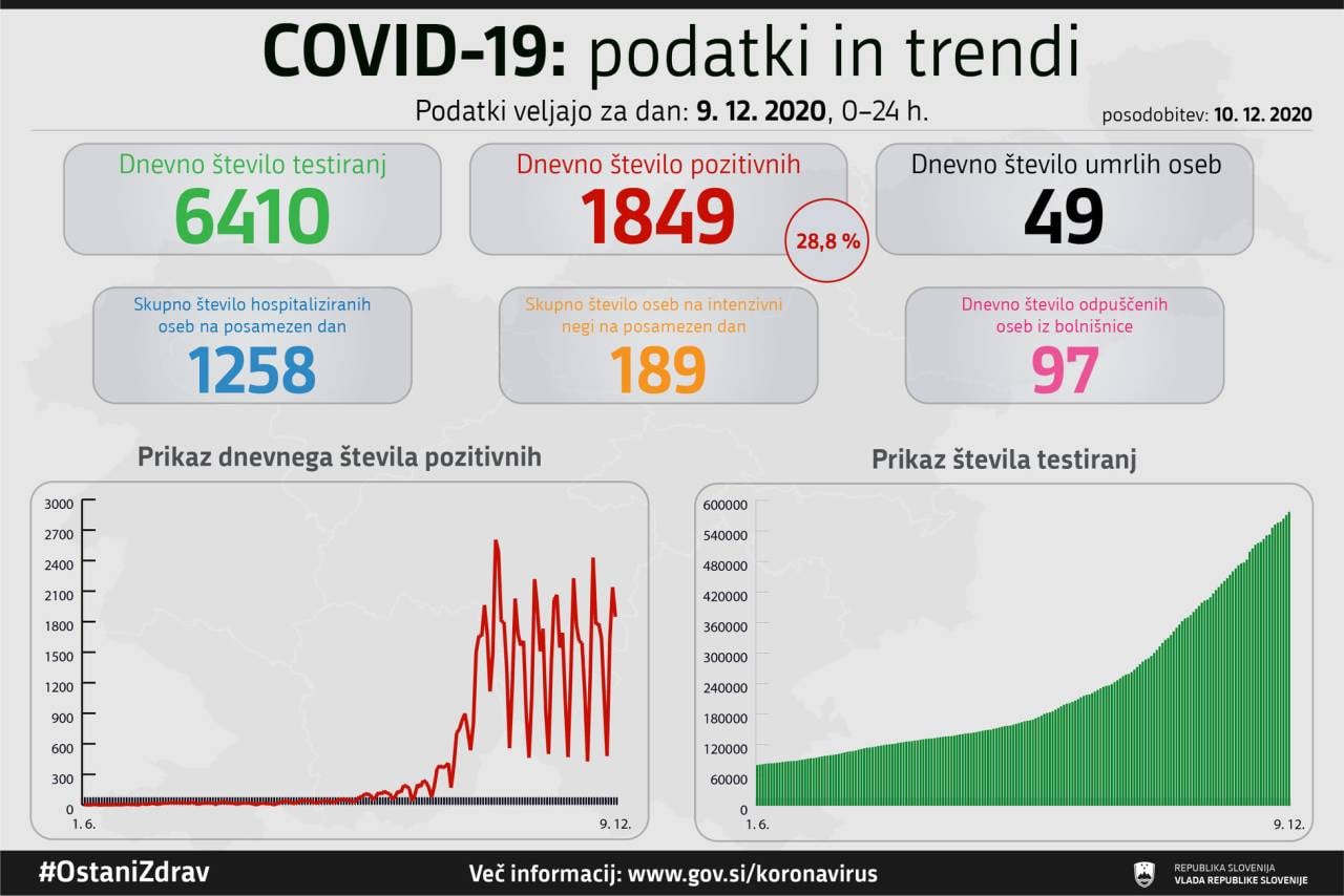 V Sloveniji so v včeraj, 9. decembra, opravili 6410 testiranj na koronavirus in potrdili 1849 novih okužb. To pomeni, da je bil delež pozitivnih testov tokrat 28,85-odstoten.
