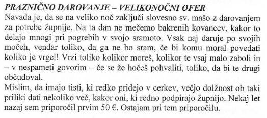 »Na ta dan ne mečemo bakrenih kovancev, kakor to delajo mnogi pri pogrebih v svojo sramoto. Vsak naj daruje po svojih močeh, vendar toliko, da ga ne bo sram, če bi moral povedati koliko je vrgel! Vrzi toliko kolikor zmoreš, kolikor te vsaj malo zaboli in - v nespameti govorim - če se že hočeš pohvaliti, toliko, da bi te drugi občudoval. Mislim, da imajo tisti, ki redko pridejo v cerkev, večjo dolžnost ob taki priliki dati nekoliko več, kakor oni, ki redno podpirajo župnijo. Nekaj let nazaj sem prvim priporočal 50 evrov. Ostajam pri tem priporočilu«, je v velikonočni prilogi zapisal Andrej Marko Poznič župnik v ihanski župniji.