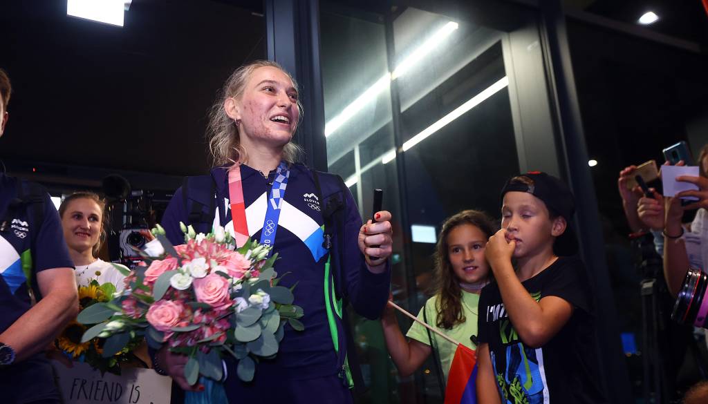 Kljub pozni uri je Janjo Garnbret, ki je na olimpijskih igrah v Tokiu Sloveniji priborila zlato medaljo v plezanju, na brniškem letališču z navdušenjem sprejela manjša množica.