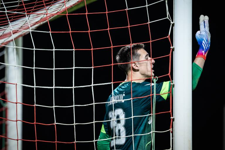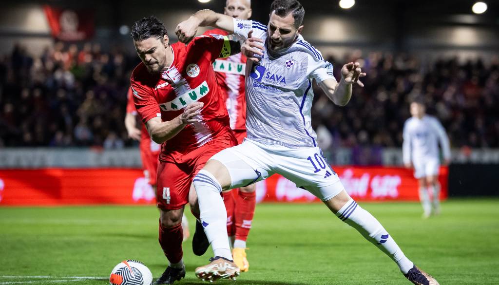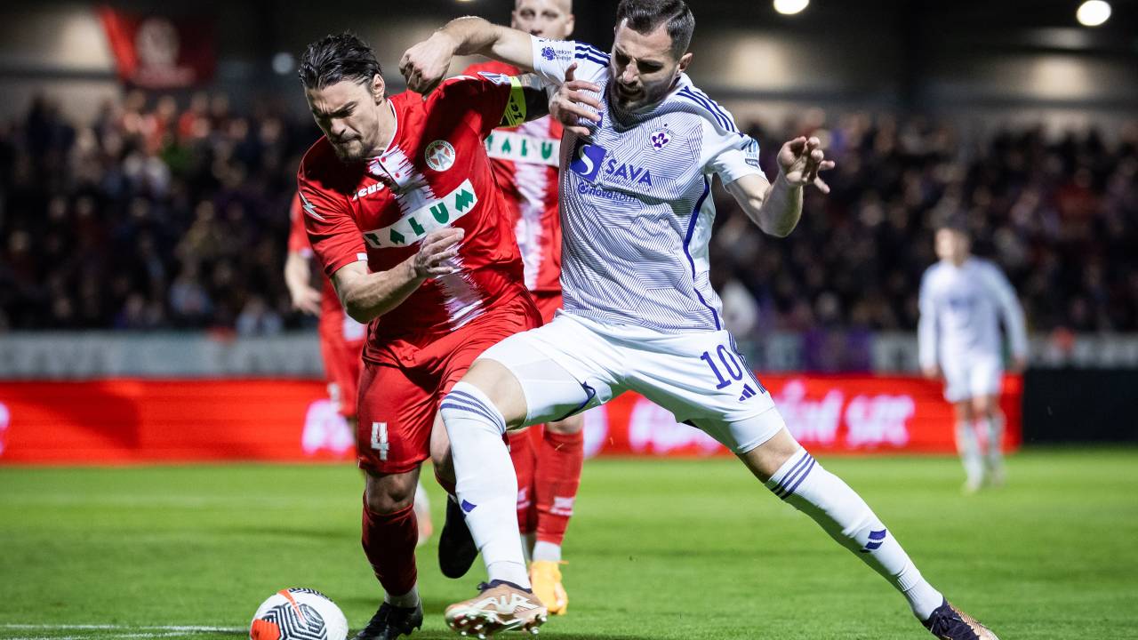 25' PRILOŽNOST! Maks Barišić je s podajo v kazenski prostor zaposlil Arnela Jakupović, ki je iz zahtevnega položaja meril proti oddaljenejši vratnici, a je bil premalo natančen v zaključku.