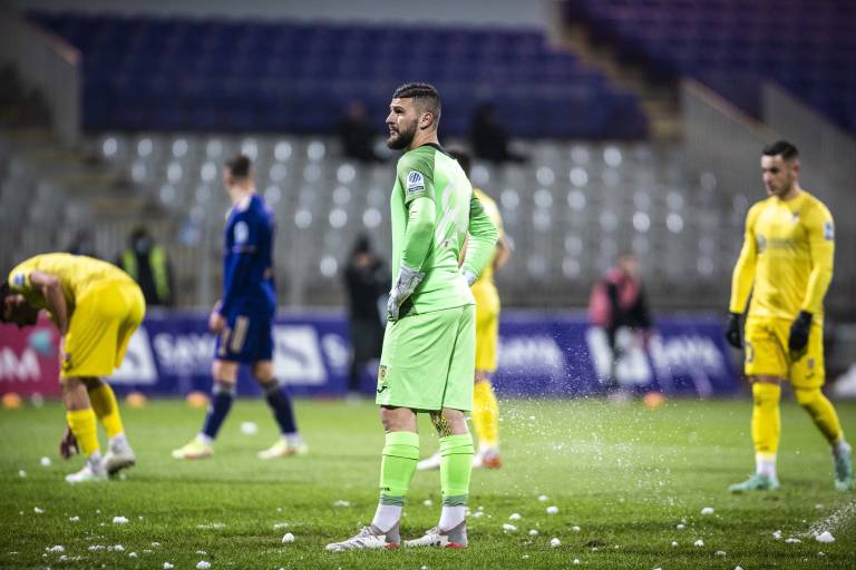 15' Viole s kepami snega obmetavajo igralce na igrišču.