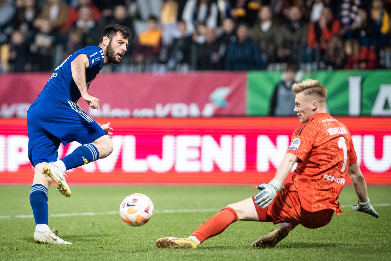 30' PRILOŽNOST! Marko Tolić je podal z desne strani kazenskega prostora, z glavo pa je sprožil Žan Vipotnik in žogo poslal nekaj centimetrov mimo desne vratnice Klemna Mihelaka.