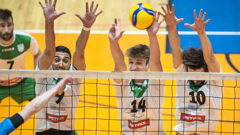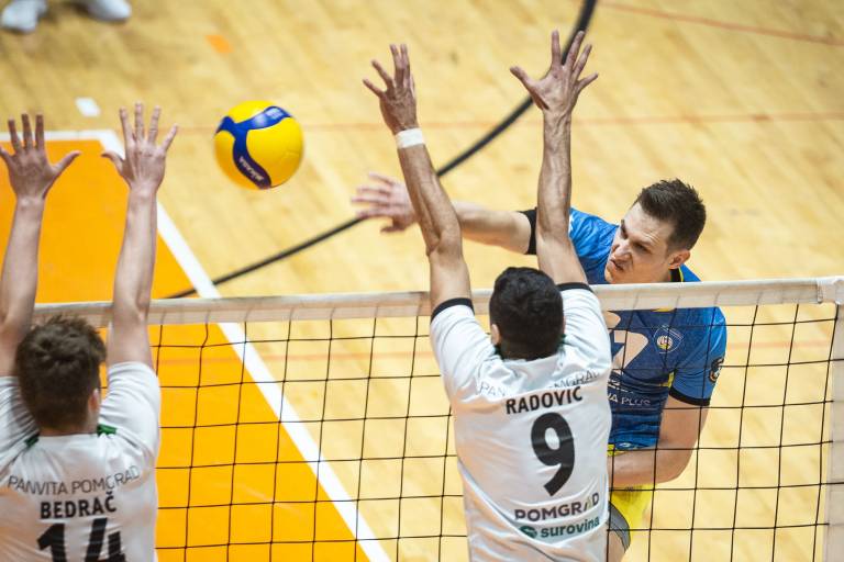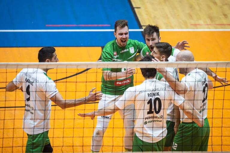 Prvi niz so bolje začeli odbojkarji Panvite Pomgrad, ki so z dobro igro prisilili domačega trenerja Sebastjana Škorca v prvi odmor na srečanju pri vodstvu s 2:6. V nadaljevanju niza so še stopnjevali ritem kar je bil povod za drugi odmor trenerja domačih Sebastjana Škorca pri rezultatu 9:14. Po nekaj dobrih zaključenih napadih in približanju na točko zaostanka je strateg Panvite Pomgrad posegel po drugem odmoru še pri vodstvu s 18:19. Domači so še stopnjevali ritem in po ključnih začetnih udarcih Uroša Planinšiča prišli na izenačenje 23:23. Po bloku Uroša Pavloviča so domači uspeli osvojiti niz s 27:25.