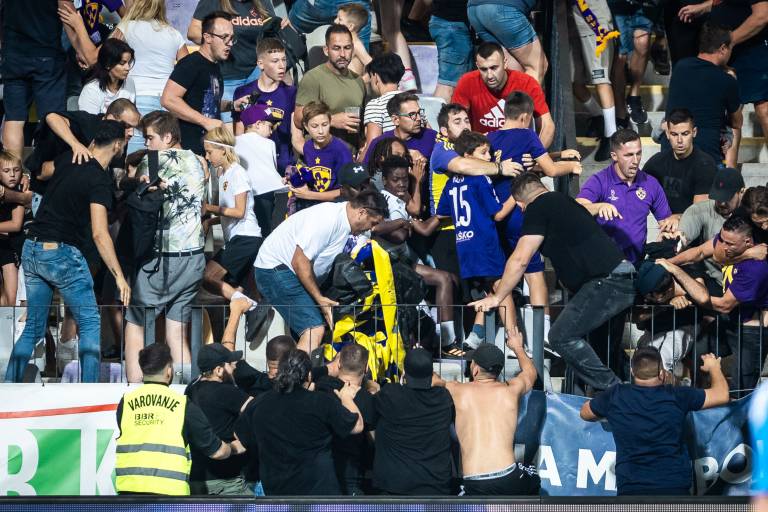 Turki so se hitro zapodili za domačo skupinico, v navzkrižnem »ognju« pa so se znašli tudi nič krivi gledalci na delu tribune, na kateri so bili tudi otroci.