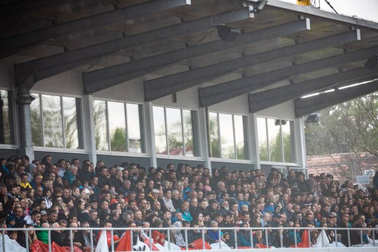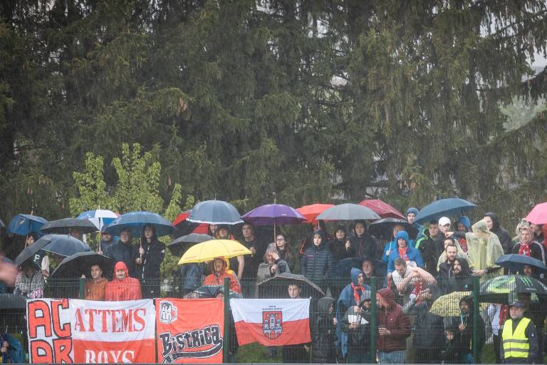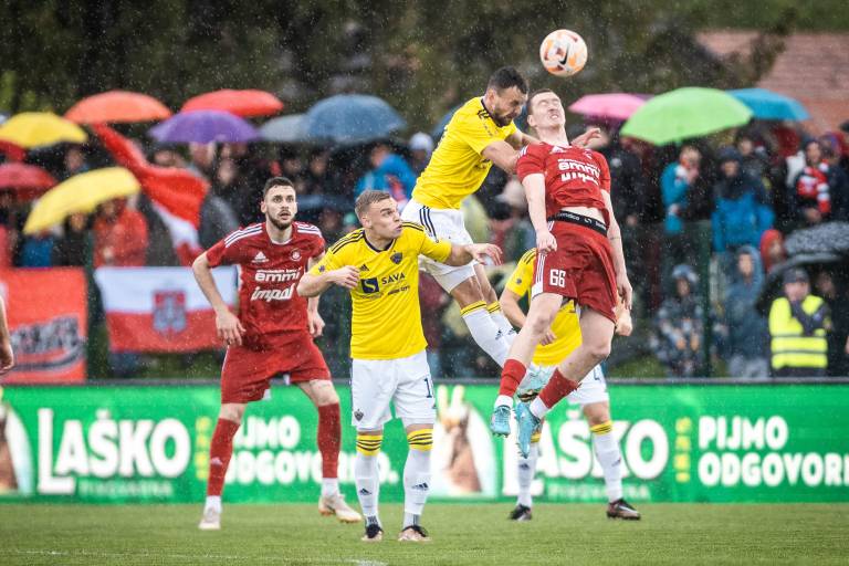7' Kljub močnemu dežju tekmo v Slovenski Bistrici spremlja lepo število gledalcev, tribuna je povsem polna, dodobra zapolnjena pa so tudi stojišča na nasprotni strani igrišča.