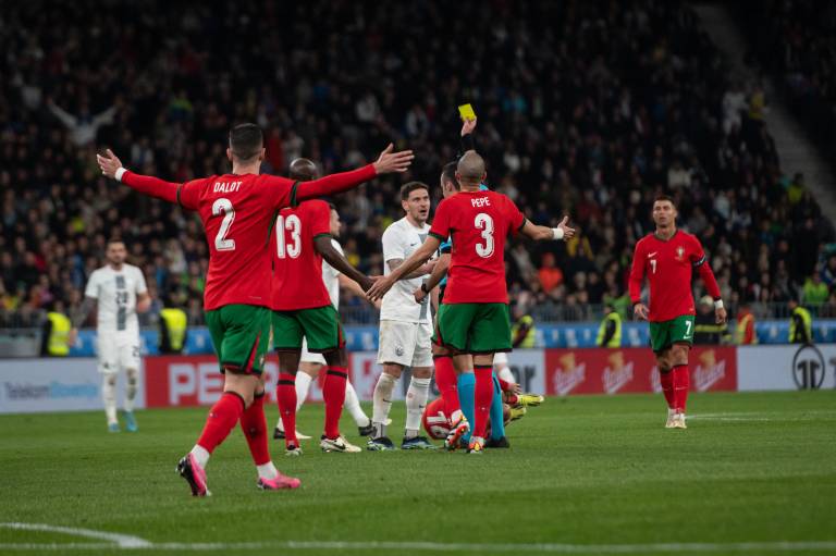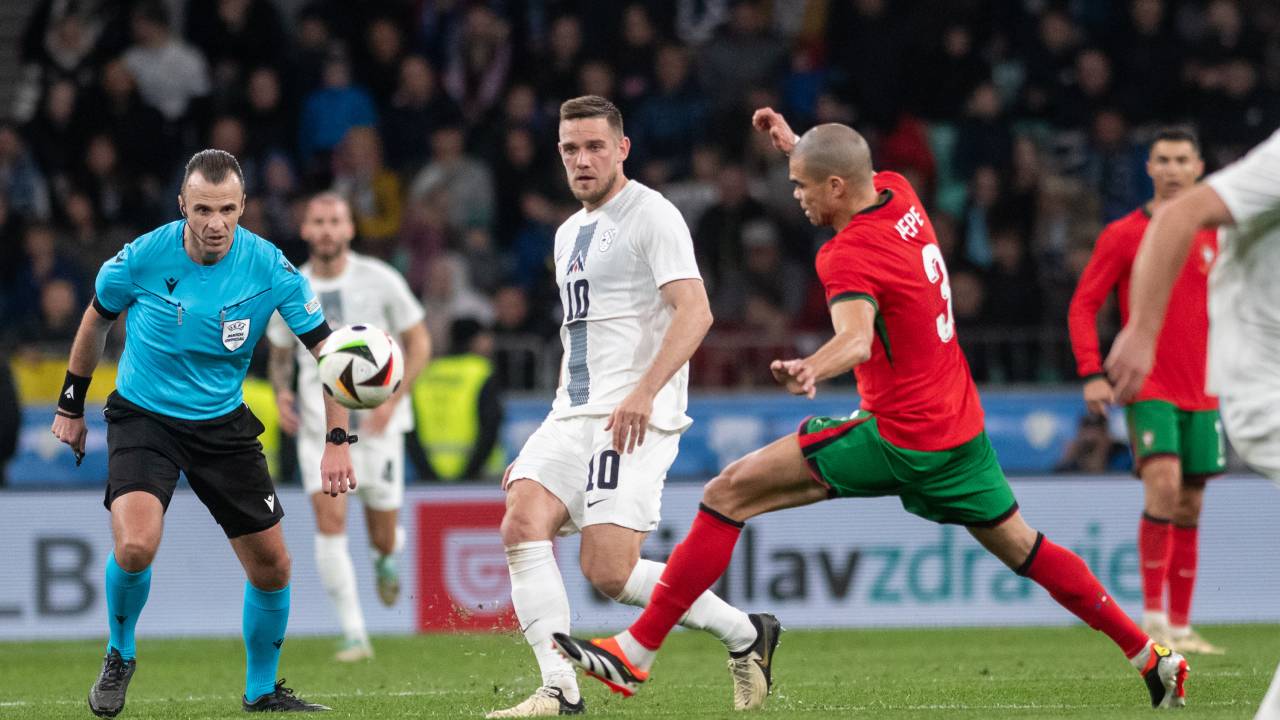 20' Pepe z glavo ni najbolje izbil dolge podaje v kazenski prostor Portugalcev, žoga pa je končala pri Andražu Šporarju. Vratar Diogo Costa, ki je zapustil svoja vrata, bi bil brez moči, a Ljubljančan ni uspel priti do zaključnega udarca, Slovenci pa so ostali tudi brez kota.