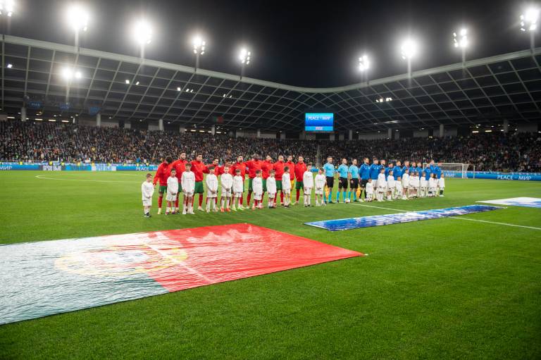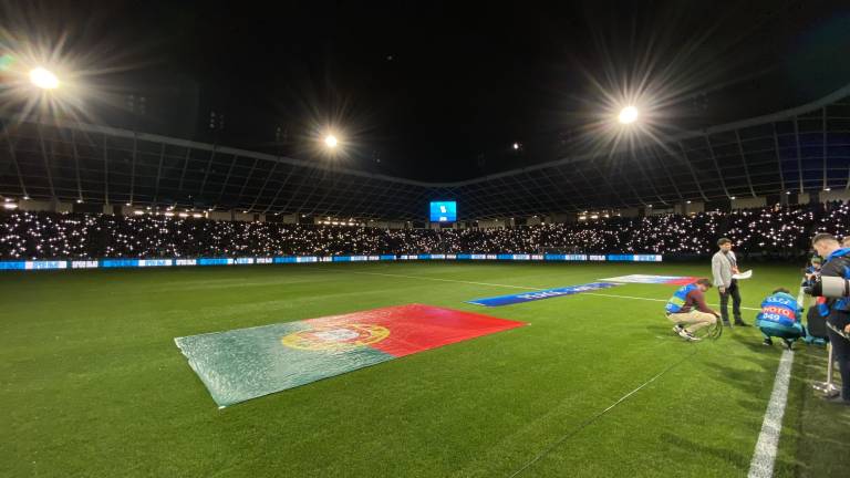 2' Slovenci in Portugalci se danes merijo na povsem novi zelenici, v Stožicah so v minulih tednih prenovili tudi ozvočenje in razsvetljavo, ki zdaj omogoča tudi posebne efekte.