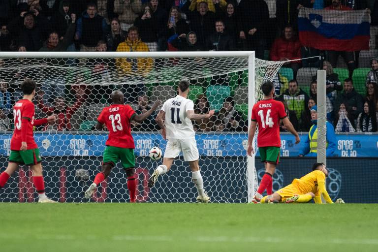 60' PRILOŽNOST! Jaka Bijol je skušal preigrati Cristiana Ronalda, a je žogo izgubil v nevarni coni, v nadaljevanju akcije pa ga je prav kapetan Portugalske izigral na desni strani kazenskega prostora in sprožil proti vratom Slovenije. Zadel je zunanji del mreže.
