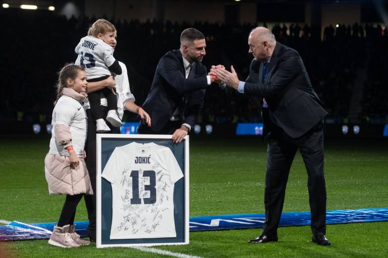 Pred tekmo: Bojan Jokić, ki je s stotimi reprezentančnimi tekmami drugi na večni lestvici slovenske izbrane vrste, je pred tekmo iz rok predsednika NZS Radenka Mijatovića prejel podpisani reprezentančni dres.