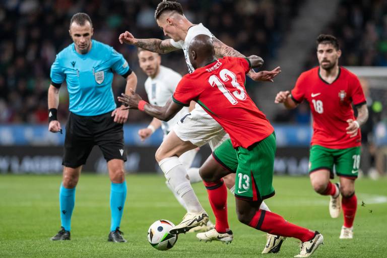 32' PRILOŽNOST! Zdaj se je priložnost ponudila tudi gostom, po podaji z desne je ob oddaljenejši vratnici sprožil Joao Felix, ki pa je slabo zadel žogo in jo poslal daleč mimo vrat Slovenije.