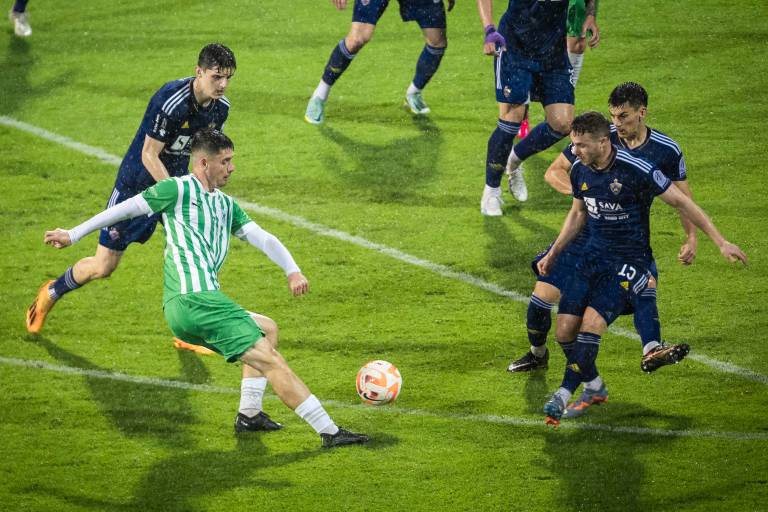 30' PRILOŽNOST! Admir Bristrić je po podaji v prostor krenil sam proti vratom Ažbeta Juga, a se je v obrambo pravočasno vrnil Ignacio Guerrico in napadalcu Olimpije z odličnim posredovanjem odvzel žogo.