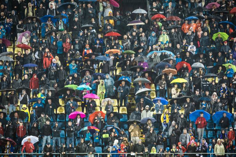 20' Namočena zelenica povzroča nekaj težav, ob bučni podpori pa nogometašem ne manjka motiva. To se kaže tudi v nekaj ostrejših posredovanjih.
