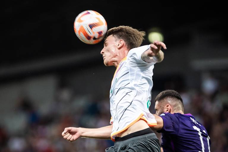 19' PRILOŽNOST! Arnel Jakpović je izvedel prosti strel z desne strani igrišča in ob oddaljenejši vratnici našel neoviranega Xhuliana Skuka, ki pa je po strelu z glavo zadel zgolj zunanji del mreže.
