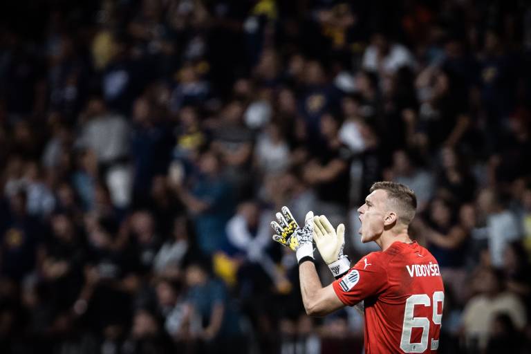 22' PRILOŽNOST! Matevž Vidovšek rešuje Olimpijo. Ivan Brnić je krenil po levi, nato pa poslal predložek mimo štirih ljubljanskih branilcev, na oddaljenejši vratnici pa se je v priložnosti znašel Žan Vipotnik. Vidovšek je strel odbil v kot.