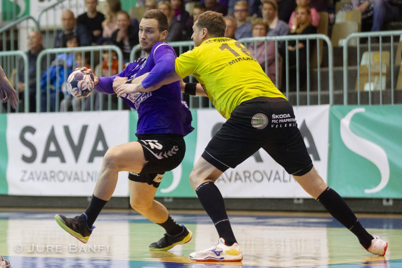 Po nekaj zapravljenih napadih na obeh straneh so prvi zadeli Mariborčani, za katere je v 4. minuti gol dosegel Iulian Jerebie. Nato smo spremljali izenačeno igro gol za gol s čvrsto igro v obrambi na obeh straneh. Ta se je obrestovala vijoličastim rokometašem, ki so v 11. minuti z zadetkom Matije Golika povedli 5:3 in po prvi minuti odmora je posegel velenjski strateg Zoran Jovičič.