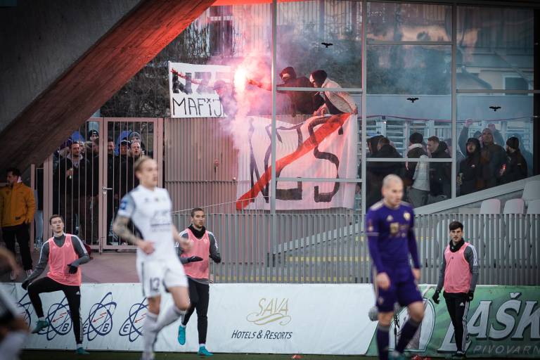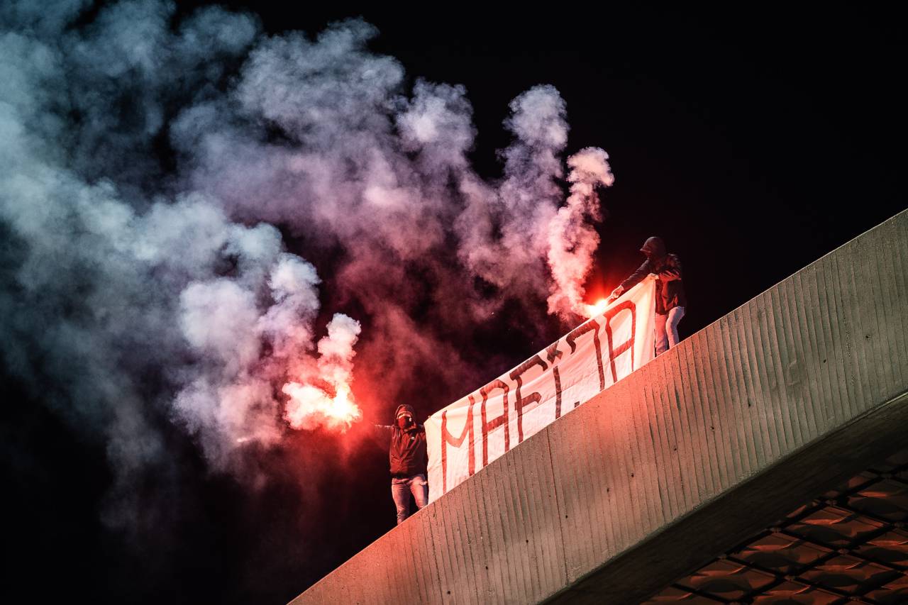 Čeprav navijači niso bili prisotni na tribuni, pa se je nekaj posameznikov povzpelo kar na streho zahodne tribune in na znamenitem loku razprlo napis »MAFIJA«. Ob še nekaj podobnih transparentih je bil zapis namenjen Nogometni zvezi Slovenije.