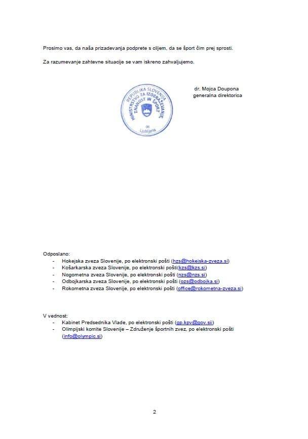 In kakšen je odgovor iz ministrstva za izobraževanje, znanost in šport? Pravijo, da je ukrepe vladi predlagala svetovalna skupina pri ministrstvu za zdravje pod vodstvom Mateje Logar, predsednik vlade Janez Janša pa je včeraj tvitnil, da naj bi ukrepe pripravila športna stroka in jih predlagala preko ministrstva za zdravje.