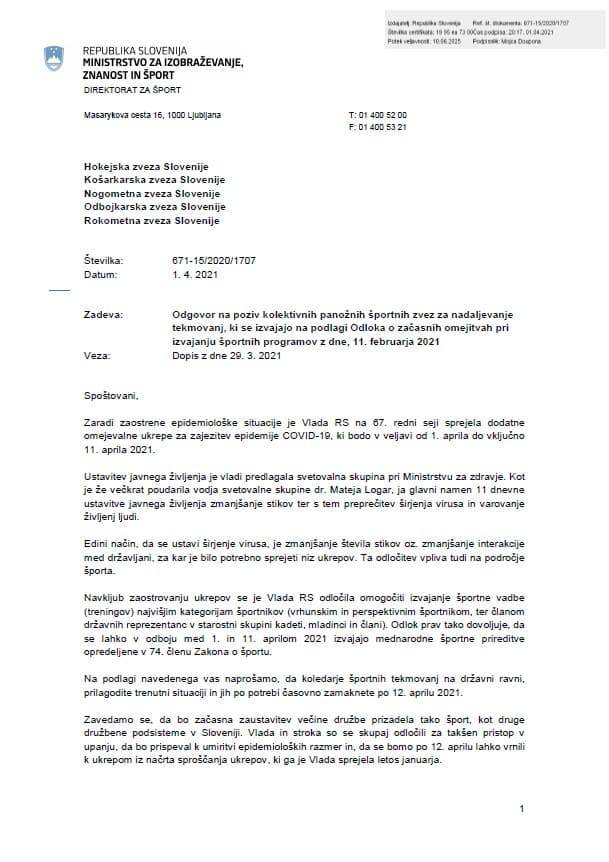 Pred dnevi je pet največjih športnih zvez skupaj pozvalo odločevalce, naj premislijo o tem, da ustavijo vsa tekmovanja na državni ravni. Odgovor so dobili, a ne tak, kot bi si ga želeli.