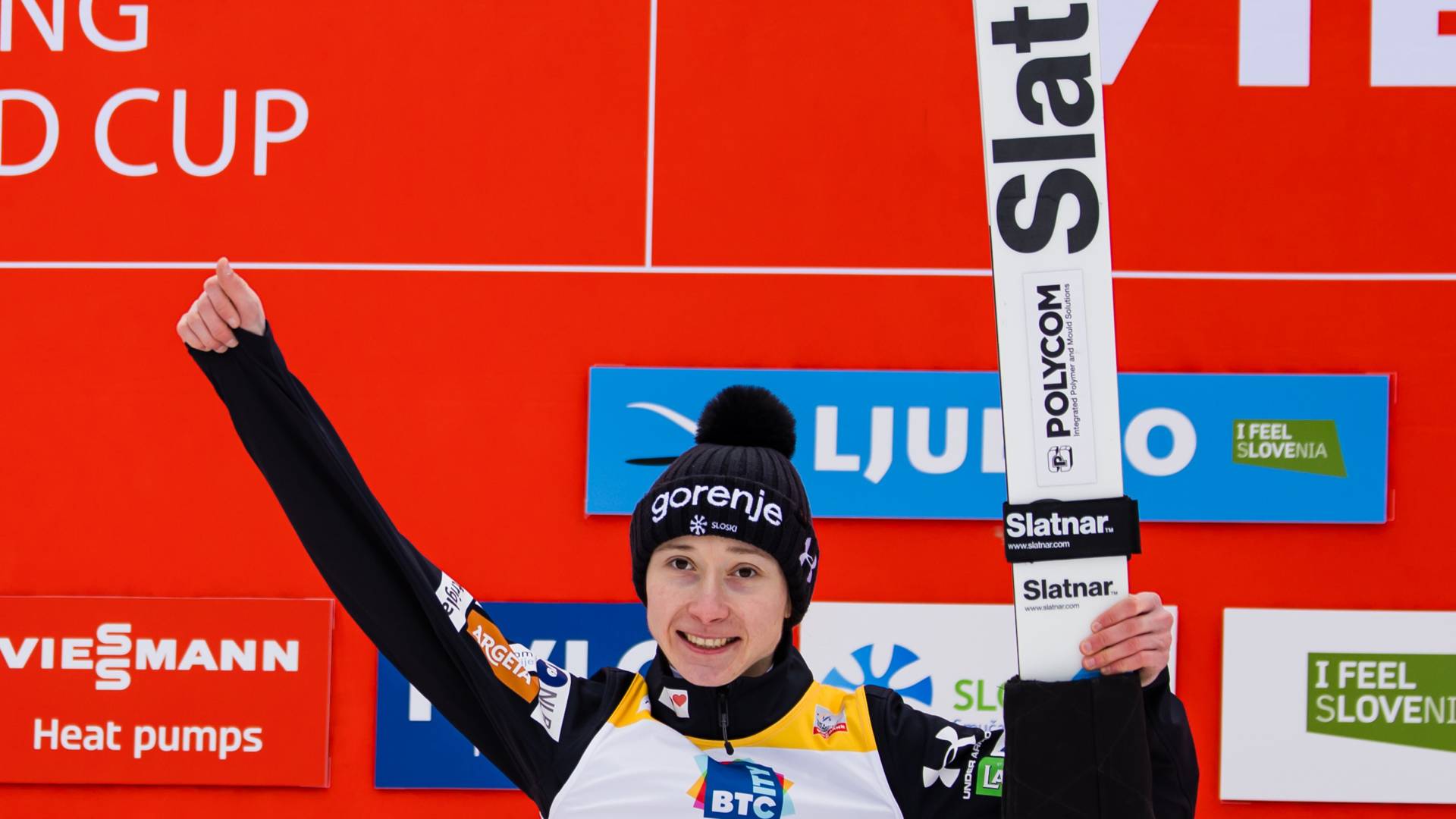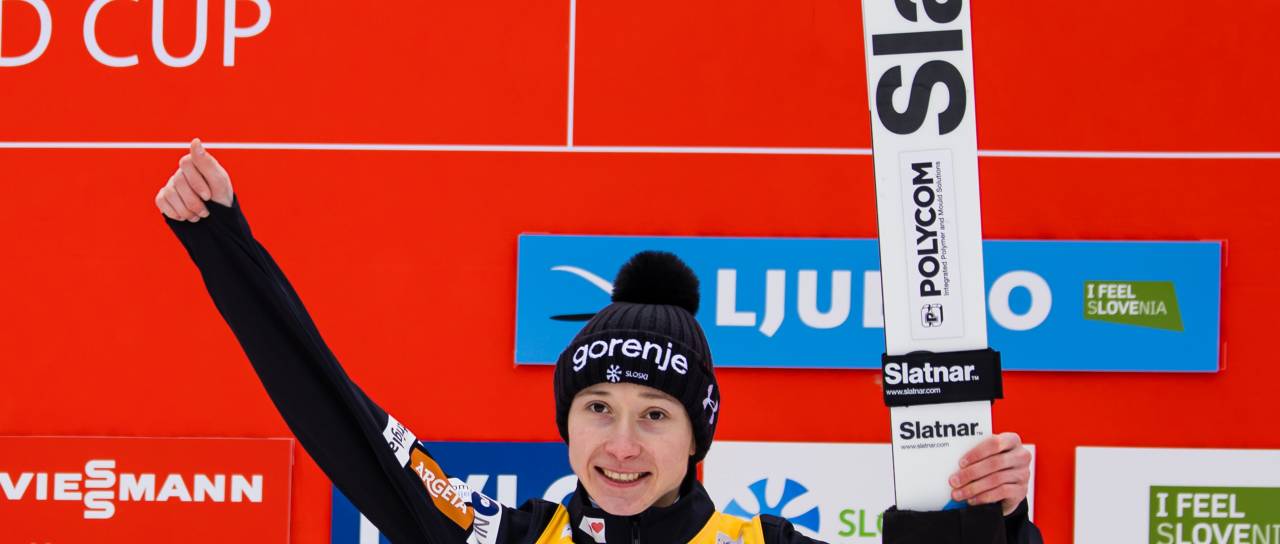 Prevc, tudi dobitnica dveh zlatih snežink na nedavnem svetovnem prvenstvu v Trondheimu, je tako Sloveniji prinesla še šesto skupno zmago.