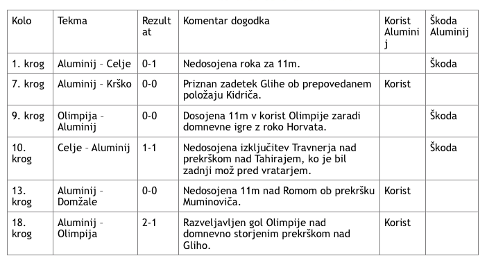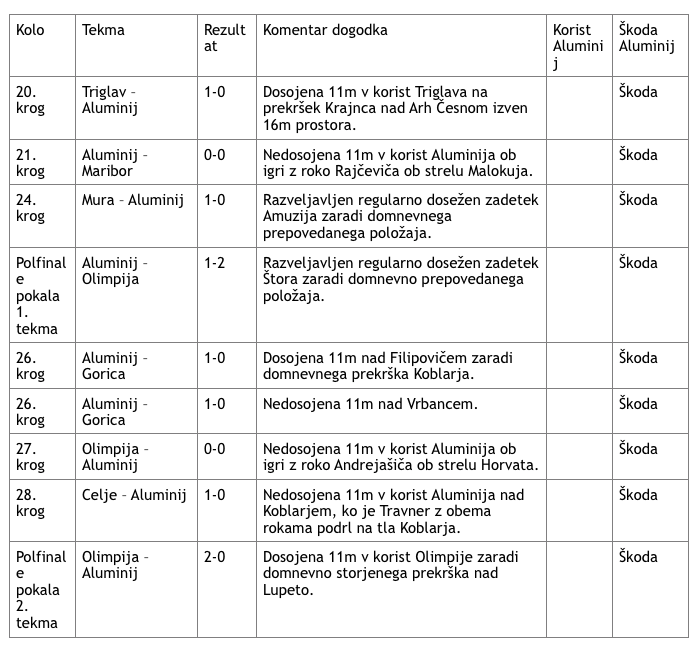 Rezultatih opravljene analize strokovnega vodstva Nogometnega kluba Aluminij kažejo izrazito negativno bilanco sodniških odločitev na tekmah Aluminija v tej sezoni.