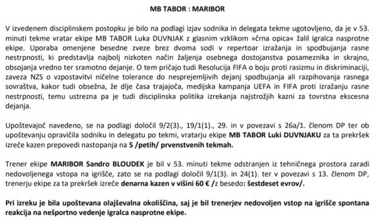 Duvnjak pa ni edini kaznovani. Na rasistični incident je namreč burno reagiral trener NK Maribor Sandro Bloudek, ki je bil zaradi nedovoljenega vstopa na igrišče odstranjen iz tehničnega prostora.