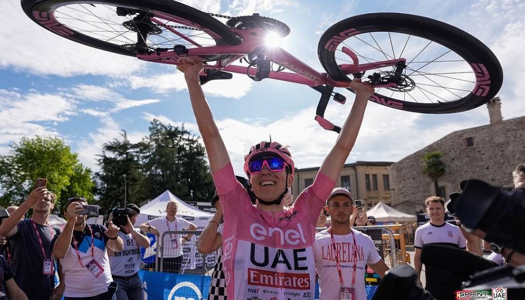 Slovenskega kolesarskega zvezdnika Tadeja Pogačarja (UAE Team Emirates) so danes v Rimu okronali kot novega kralja Dirke po Italiji. To mu je uspelo kot drugemu Slovencu po lanskem slavju Primoža Rogliča.
