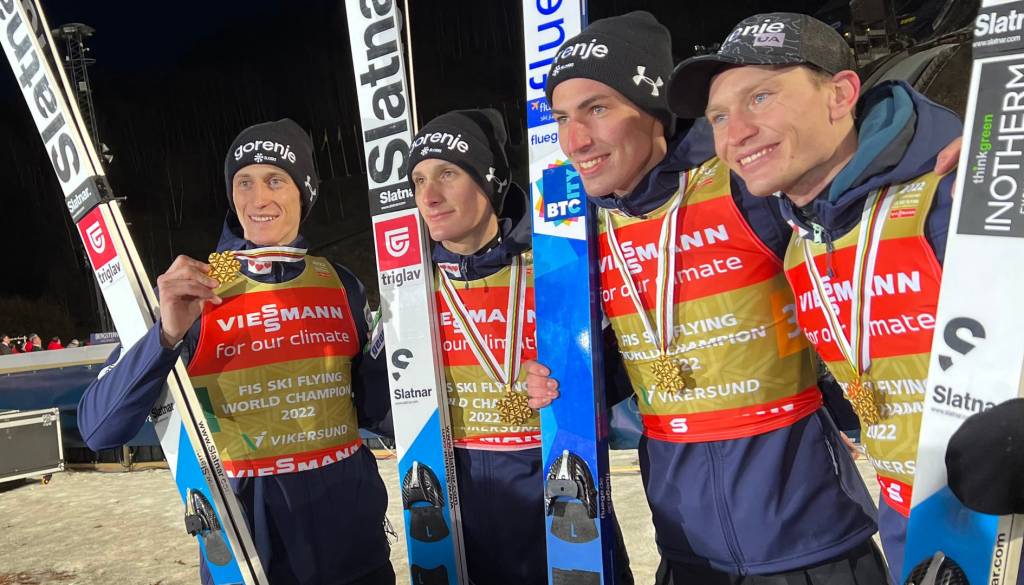 Danes je slovenska četverica osvojila tretjo ekipno kolajno po Vikersundu 2012 (Jernej Damjan, Jurij Tepeš, Jure Šinkovec, Robert Kranjec) in Oberstdorfu 2018 (Anže Semenič, Jernej Damjan, Domen Prevc, Peter Prevc).