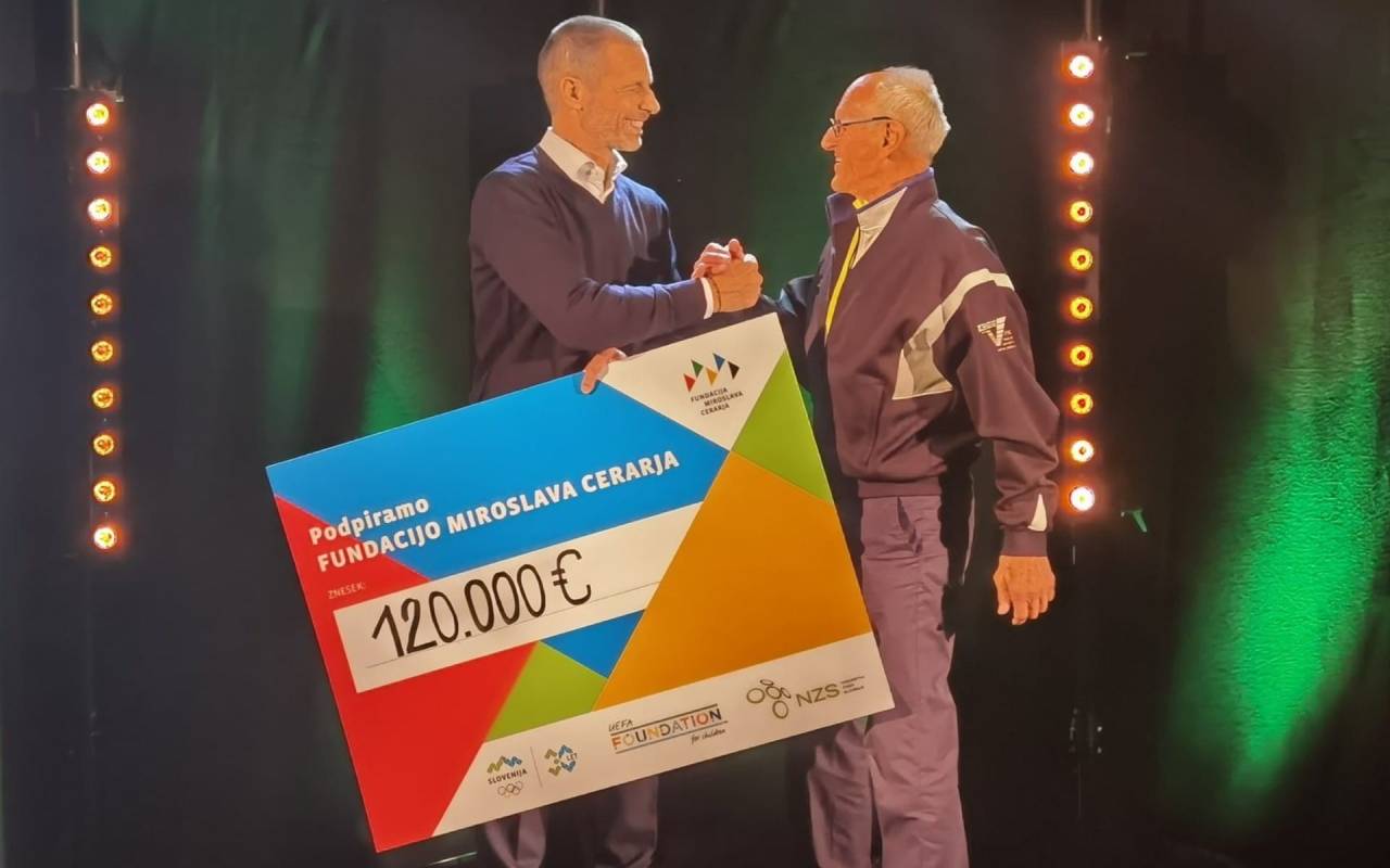 Aleksander Čeferin je po dobrodelni nogometni tekmi Fundaciji Miroslava Cerarja predal ček v višini 120 tisoč evrov, ki bodo namenjeni športnemu udejstvovanju otrok iz socialno šibkega okolja. Ob Čeferinu sta spregovorila tudi Luis Figo in Tina Maze.