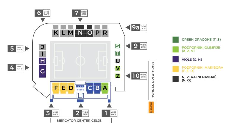 Razdeljena pa bo tudi vzhodna tribuna – na levem delu bodo sektorji, namenjeni privržencem Maribora, v sredini tako imenovani nevtralni sektorji, na desni strani in na delu severne tribune pa sektorji, namenjeni podpornikom Olimpije.