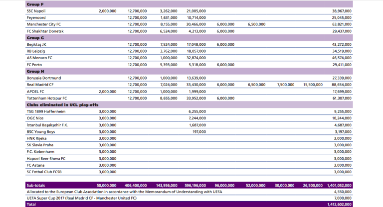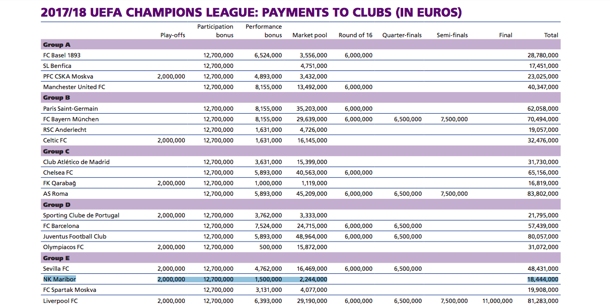 UEFA je objavila zaslužke vseh nogometnih klubov, ki so v pretekli sezoni nastopali v skupinskih delih evropskih klubskih tekmovanj. Toliko je v ligi prvakov zaslužil Maribor.