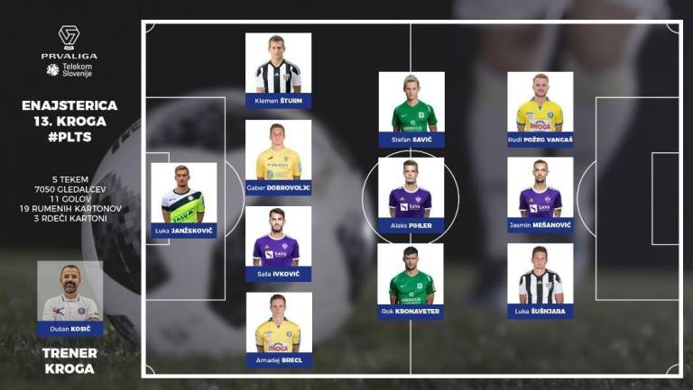 V vratih se je v idealni enajsterici 13. kroga znašel Luka Janžekovič iz Aluminija, v obrambni vrsti pa so Amadej Brecl iz Celja, že omejeni Saša Ivković iz Maribra, Gaber Dobrovoljc iz Domžal in Klemen Šturm, član Mure.