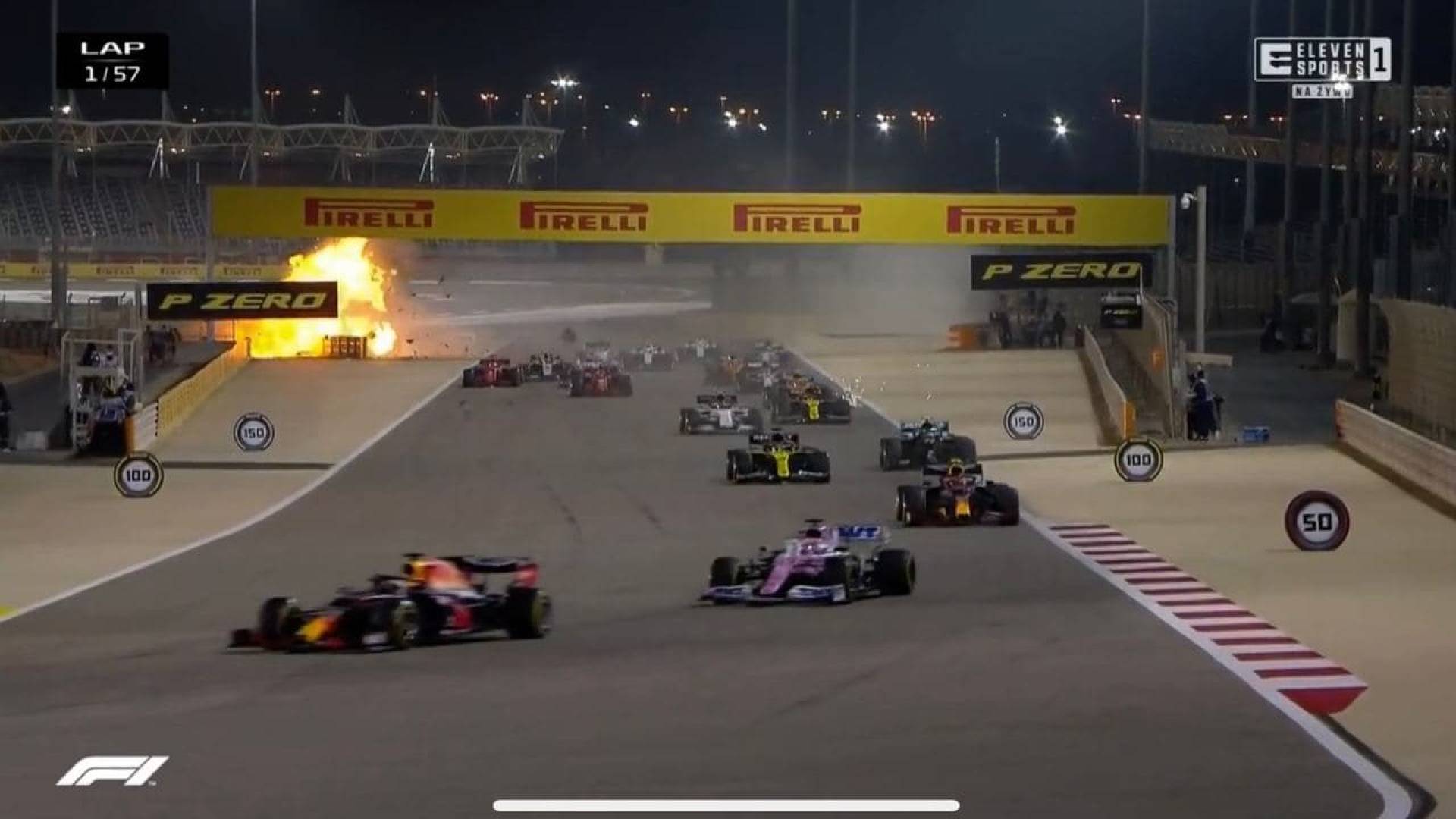 Romain Grosjean je že po nekaj zavojih po začetku dirke silovito trčil v kovinsko zaščitno ogrado, kaj hitro so njegov bolid zajeli ognjeni zublji, prav neverjetno pa je, da dirkač Haasa ni dobil hujših poškodb. Po prvih podatkih naj bi imel manjše opekline po rokah in nogah.